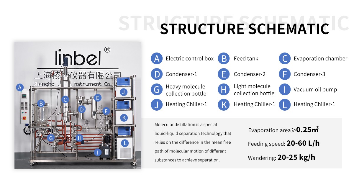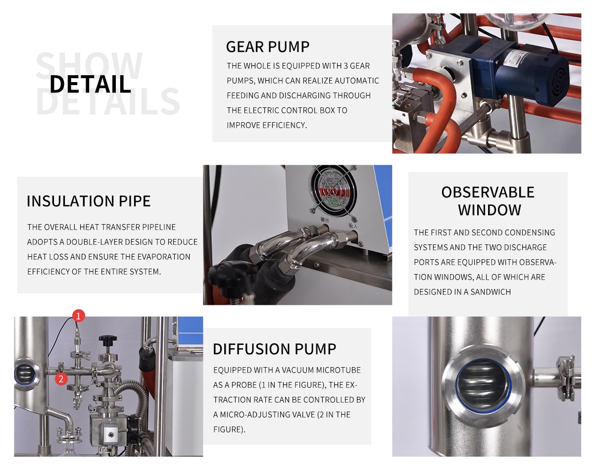 Stainless steel molecular distillation is mainly composed of heating jacket, internal rotatable scraper, condenser and vacuum system. Its advantage is suitable for liquid with high viscosity, easy crystallization, easy scaling, suspended solids or heat sensitivity.
